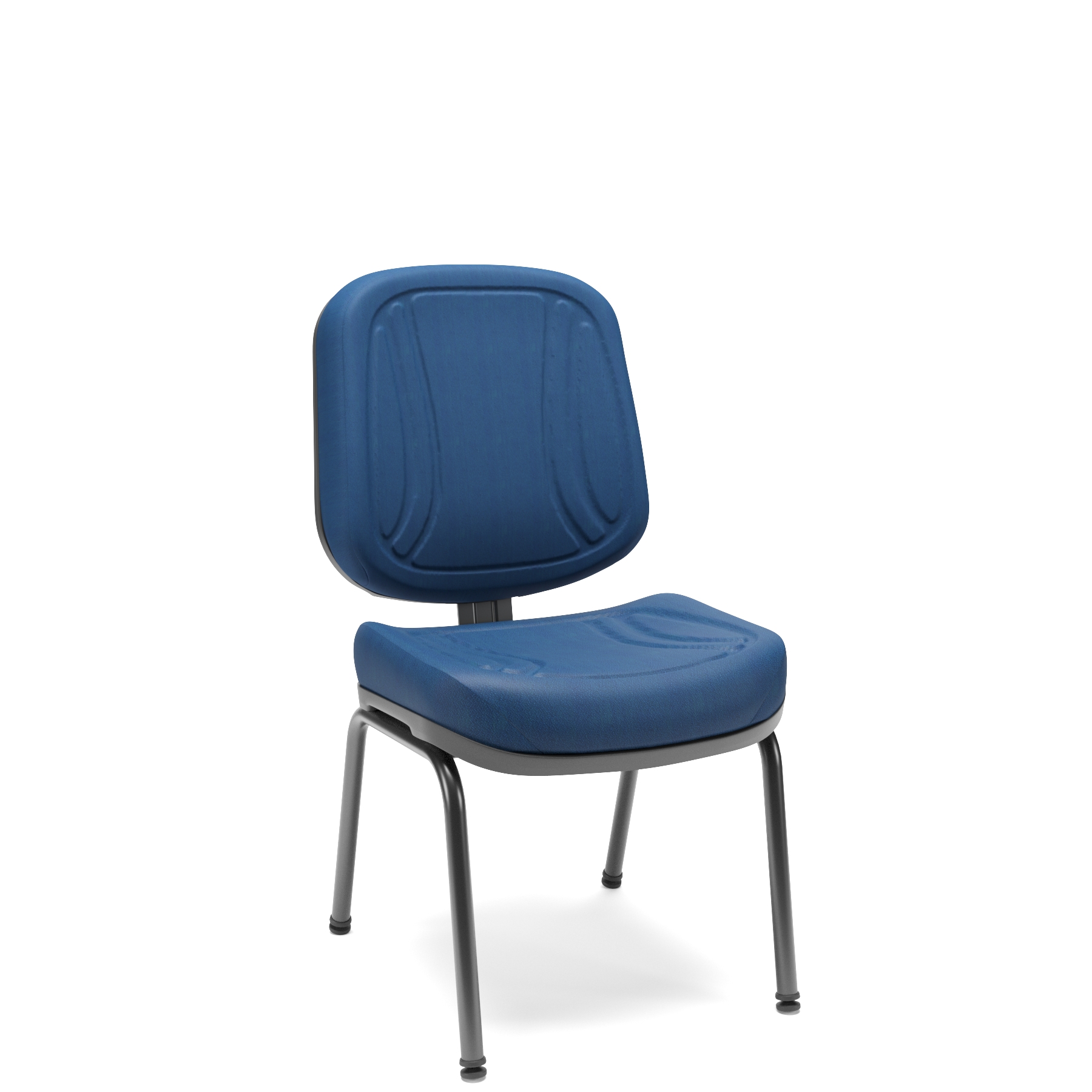 Cadeira com estofamento em courino – opcional – braços e pés em aço cromado, braço intermediário opcional e sapatas reguláveis.